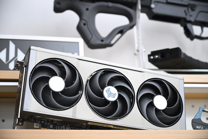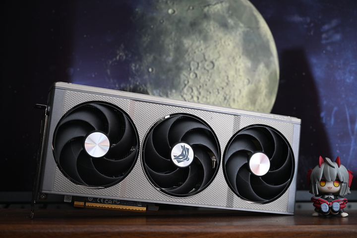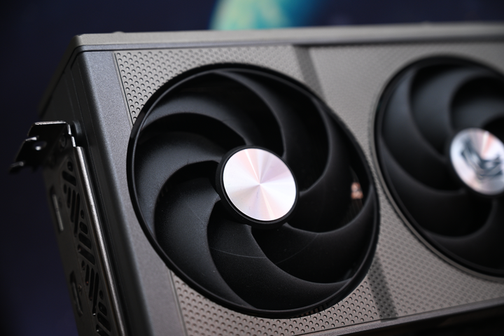 散热总成方面,风扇采用三把新一代飞翼轴流风扇,构成对称式三风扇布局,这也是 Nitro+ 系列标志性的散热配置之一。90cm直径,7 片加强式飞翼式优化叶片,“两正一反” 的特殊安装方式用于抵消风扇旋转产生的气流涡流,减少风阻与噪音,同时优化整体风道压力分布,使气流更加均匀地覆盖整个散热鳍片组,提升散热效率。