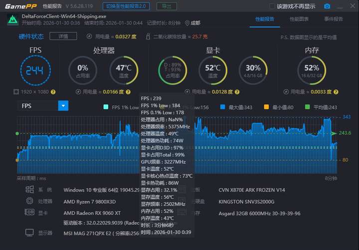 在1K低特效下,蓝宝石氮动 RX 9060 XT 16G平均帧突破了240FPS,1% Low帧163,完全达到了竞技水平,这还是没有开启FSR3.0插帧模式的情况下.