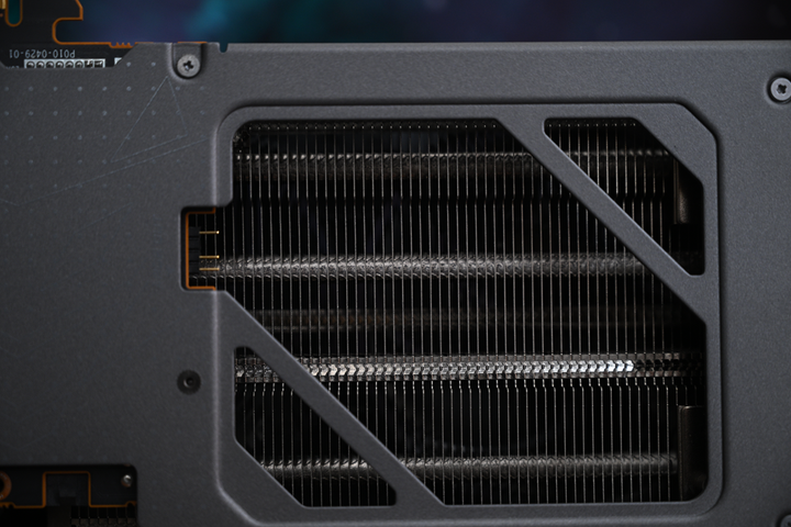 这块显卡的散热总成名为FREE FLOW 急速风道冷却系统,内部拥有4条6mm纯铜镀镍复合热管,配合导流槽和高密度堆叠设计的散热鳍片,形成高效的热传导路径,确保核心温度始终维持在合理范围内。