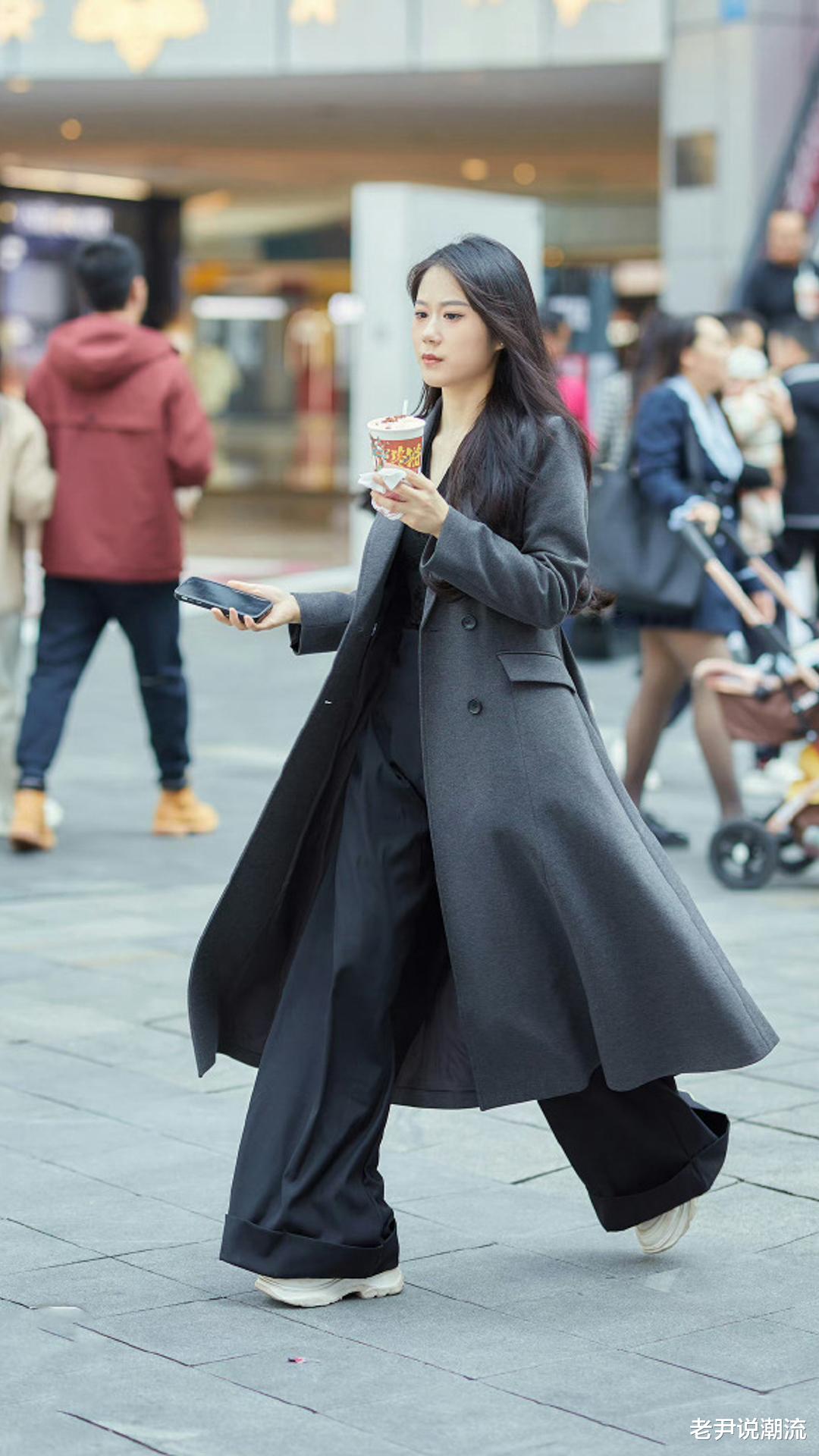 长大衣与阔腿裤的组合本身极具流动感,显得随性潇洒。而黑色包的方正廓形和精致的细节,则为这份随性注入了优雅与力量,达到了完美的平衡。