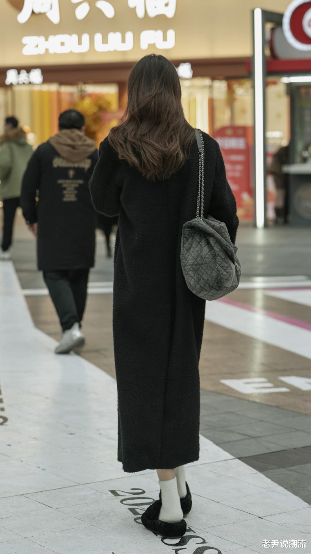 一件宽松的黑色长款毛绒大衣,营造出温暖、慵懒的包裹感。巧妙地用白色短袜搭配黑色穆勒拖鞋,露出了纤细的脚踝。这种“上宽下窄”的穿法,瞬间打破了长款外套可能带来的拖沓感,显得整个人轻盈又利落。