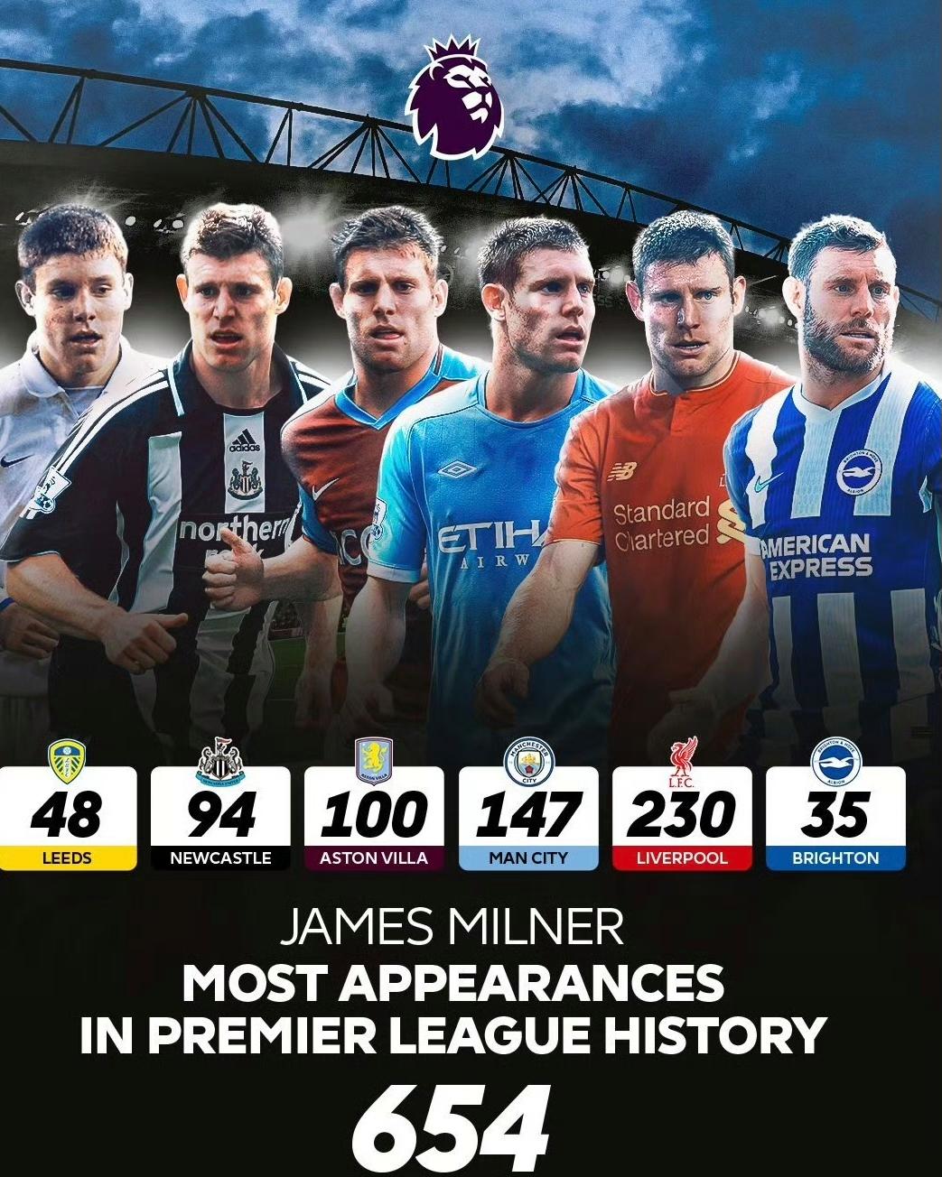 40岁的詹姆斯·米尔纳在周六再次登场,他正式以654次出场打破英超历史纪录,成为这项运动1992年改制以来的“出场第一人”。