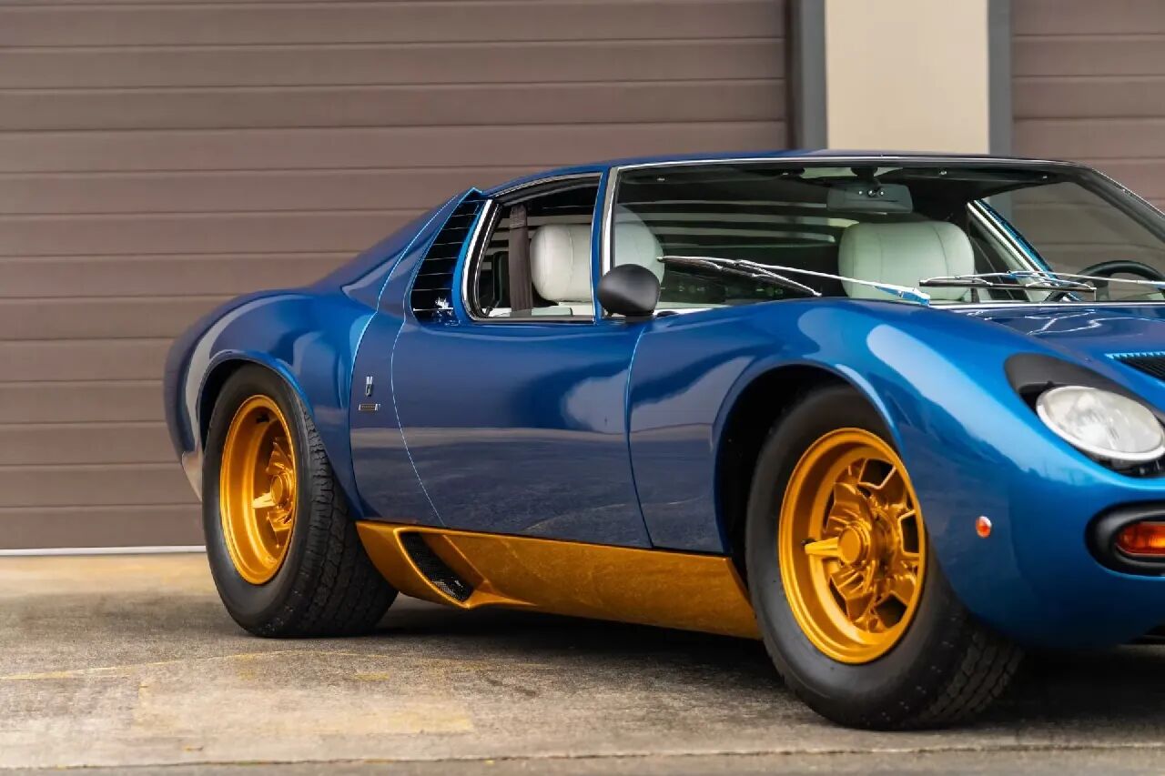 在 Diablo(迪亚波罗)、Murcielago(蝙蝠)、Aventador(埃文塔多)让 SV 标识家喻户晓之前,Lamborghini 早已将这两个字母赋予 Miura,而 Miura SV 正是缪拉车系的终极进化版,全球仅量产 150 台,如今已是顶级藏家追逐的珍品。这台待拍车尤为特殊,采用独一无二的 Bleu Tahiti(塔希提蓝)车漆,侧裙与轮毂搭配金色装饰件,视觉效果华丽夺目,内饰则以纯白色皮革包裹座椅、门板、车顶与中控台,内外配色堪称绝配,将 Miura 本就惊艳的设计推向极致。