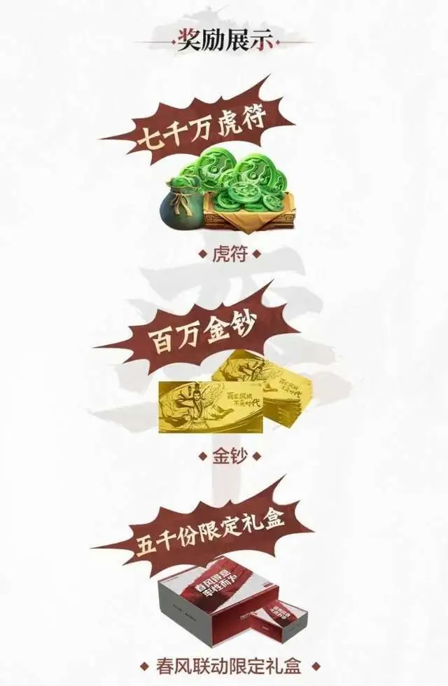 首先是开荒大礼包。所有在新服参与开荒打城的玩家,都可以参与瓜分7千万虎符、价值百万金钞、5000份春风联动限定礼盒。首占5级地,还有机会触发“彩蛋”爆9999虎符,单人最高可获得12279虎符+价值549的0.5g金钞一件+春风联动限定礼盒,堪称是零氪党的福音。