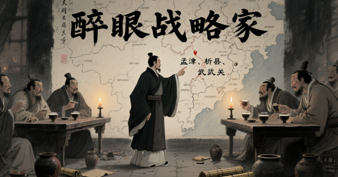 漫画1:醉眼战略家【画面】昏暗烛光下,曹操独自站在地图前,其他诸侯围坐饮酒作乐,酒杯折射出扭曲的脸曹操(手指戳地图):"