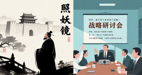 漫画6:照妖镜【画面】现代办公室场景,西装革履的"酸枣派"仍在开会,投影仪显示"战略研讨会"画外音(曹操):"当年酒宴照见群雄,今朝会议室照见众生相"实习生(举手):"领导,我们是不是该换个战略?"老板(看表):"急什么?先喝完这杯茶..."【现代认知】警惕"正确但无效"的职场文化,真正的战略需要破局勇气
