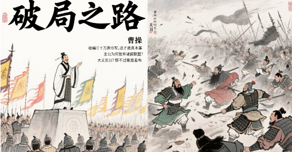 漫画5:破局之路【画面】对比两组画面:左-曹操在扬州招兵买马;右-诸侯困在混战曹操(对部下):"收编三十万黄巾军,这才是真本事"关羽(困惑):"主公为何放弃诸侯联盟?"曹操(笑):"大义名分?那不过是遮羞布"【现代认知】建立个人核心优势比依附集体更重要,战略定力决定成败
