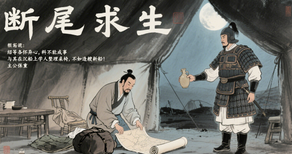 漫画4:断尾求生【画面】深夜军营,曹操收拾行装,月光下地图被卷起扔掉曹操(独白):"绍等各怀异心,料不能成事"士兵(递酒壶):"主公保重"曹操(饮尽烈酒):"与其在沉船上学人整理桌椅,不如造艘新船!"【现代认知】职场止损比努力加班更重要,及时跳出错误赛道是智慧
