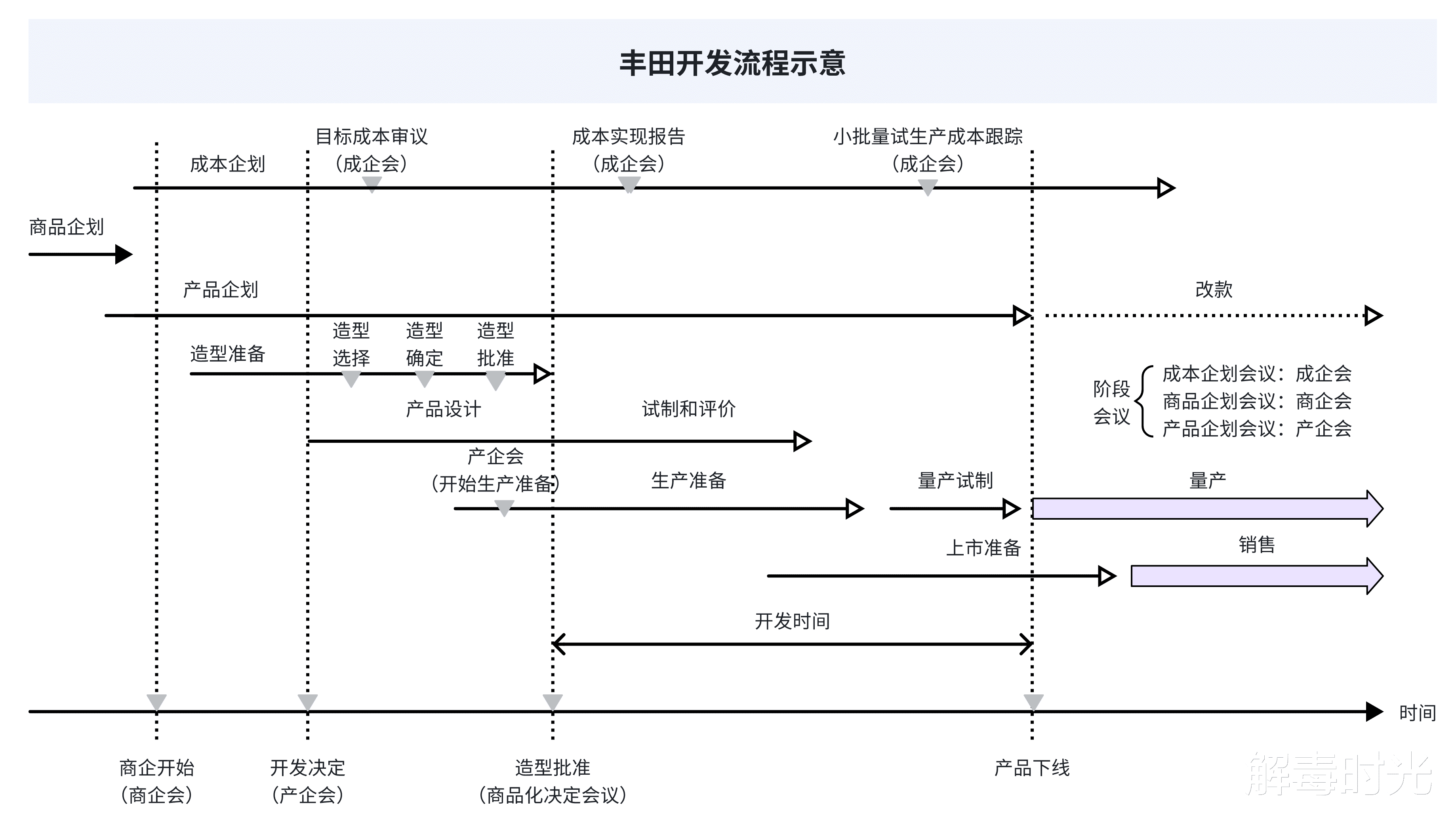 从流程的角度看,丰田的CE开发模式由三条主线驱动:商品企划、产品企划和成本企划,涉及三个决策会议:商企会、产企会和成企会。由商品企划开始,在确认商品立项之后,产品企划正式启动,同步的成本企划介入,通过目标成本审议、成本实现报告和小批量生产成本跟踪来逐步收敛对成本的控制。另一边产品企划要落实产品概念,推动造型设计、产品设计、试制和评价、生产准备和上市准备。