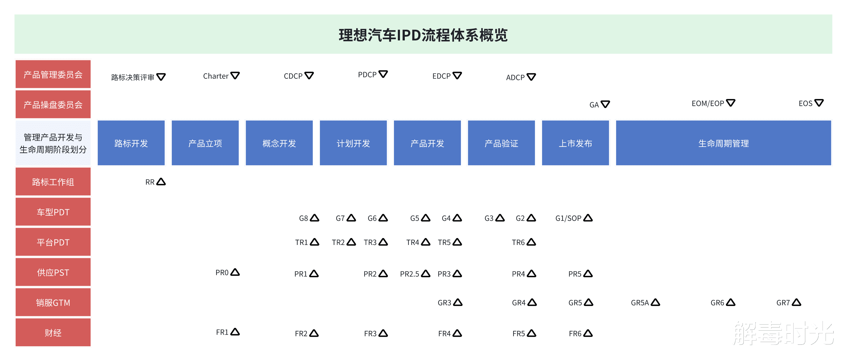 理想在IPD转型最彻底的2023年,构建的IPD流程体系,核心是从产品开发节奏出发,用阀点的方式控制整个流程的推进。其中产品管理委员会是产品决策的最高机构,产品操盘委员会是产品商业化的最高决策机构。在此基础上,分为路标工作组、车型PDT、平台PDT、供应PST以及销服GTM和财经。