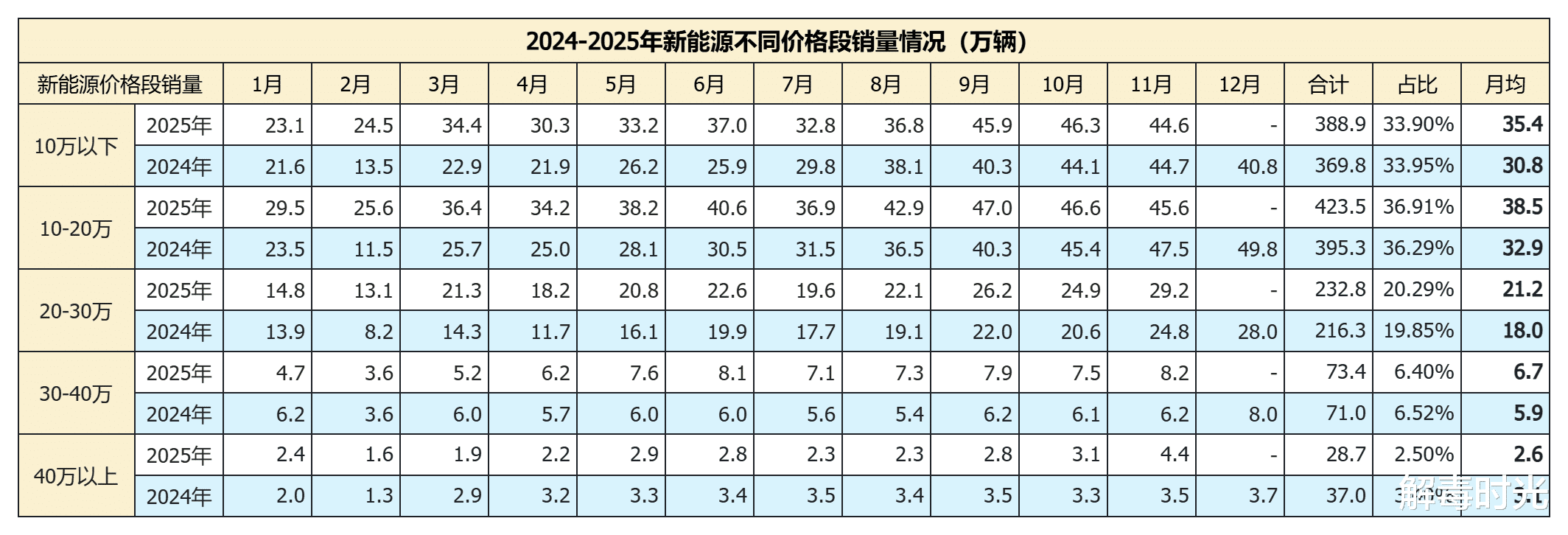 从理想的调整来看,从产品部门分离出产品线,任命产品线总裁,并将产品线进一步整合,越来越像丰田的CE模式。此前理想的问题就在于,针对原本并不大的细分市场中,将自己的组织分为三个产品线,资源和精力过于分散。从2024-2025年的月度新能源市场分价位段的销量数据来看,40万以上大概占总体市场3%左右,30-40万大概在6.5%左右,20-30万市场虽然大,但也只是占总体市场20%上下。