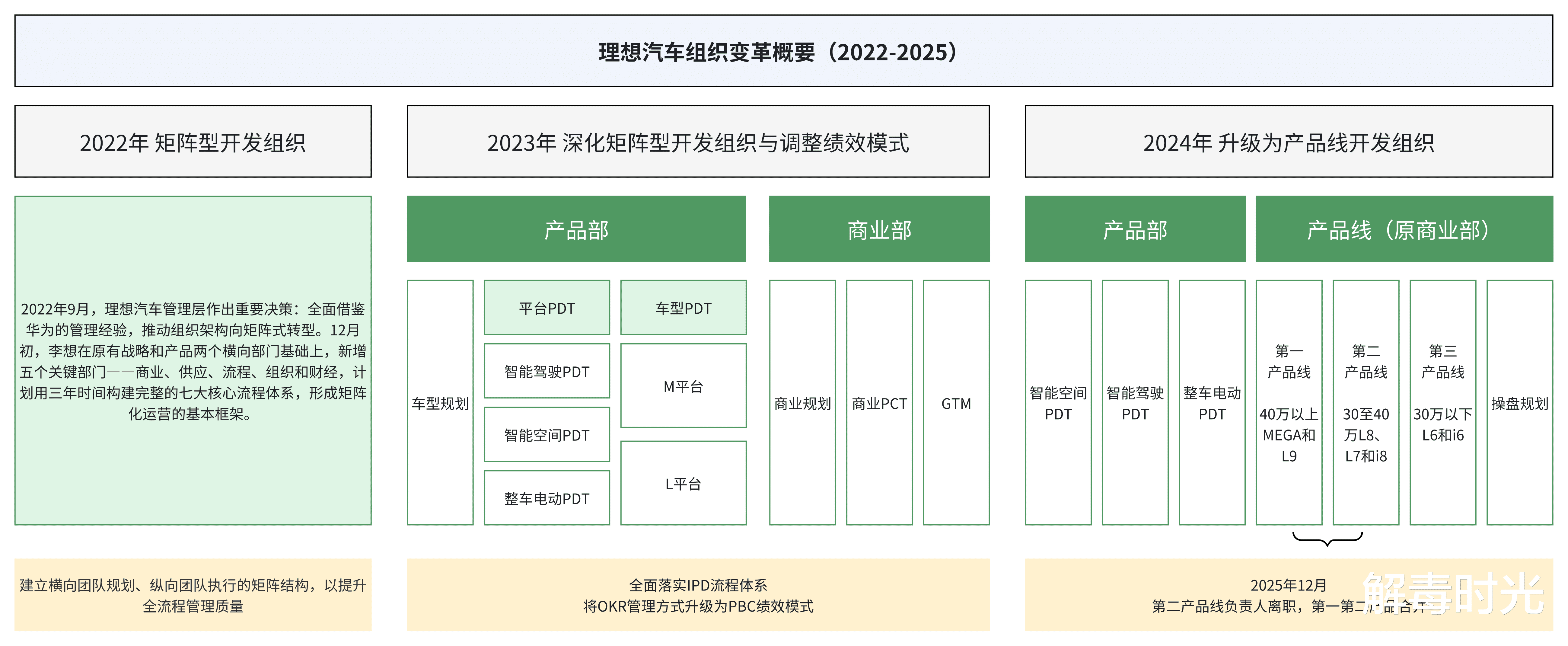 随后的时间里,理想在2024年底拿到了历史最好成绩的58,513月销,但也在2025年下半年发布了两款纯电新车i8和i6之后陷入了增长陷阱,月销徘徊在3万到4万之间,直到12月因为产品线负责人离职再一次调整产品开发组织。总的来看,理想在经过了初期产品成功后,快速向矩阵型开发组织转变,经过三年的磨合,从IPD流程驱动,渐渐明确为大产品线模式驱动。