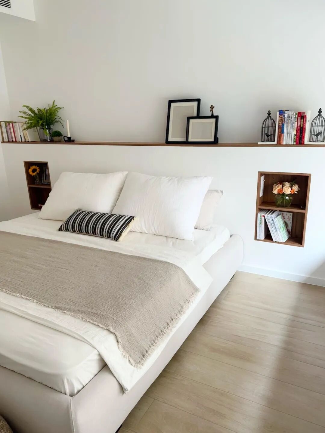 如果装修时做了床头背景墙,一定要试试壁龛!不用单独占地方,在背景墙留一个深龛,刚好卡在床头,手机、眼镜、手表放进去,不占台面,还不凌乱。