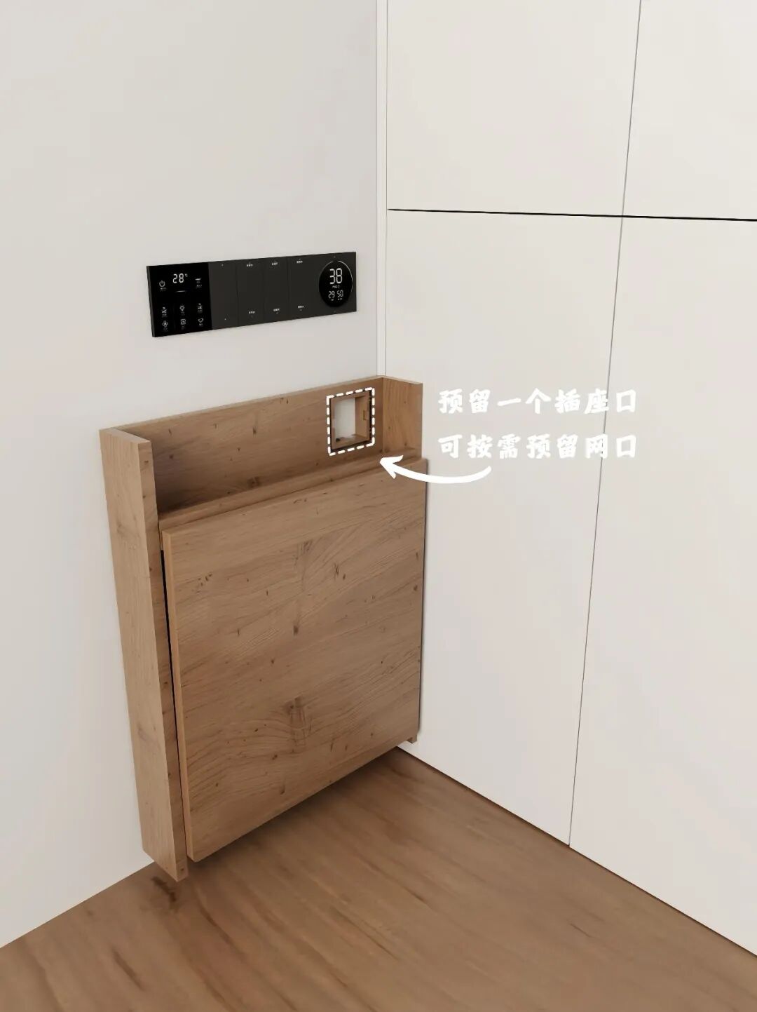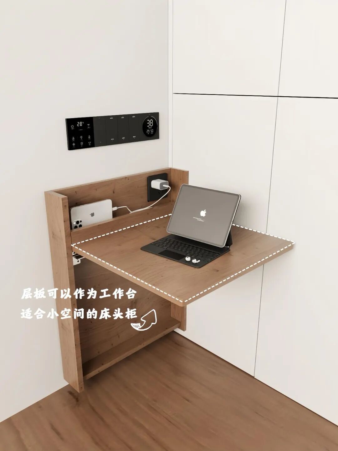 而在墙面装一块折叠桌板,薄薄一层,不占地,放手机、台灯、几本书,简洁又大气。