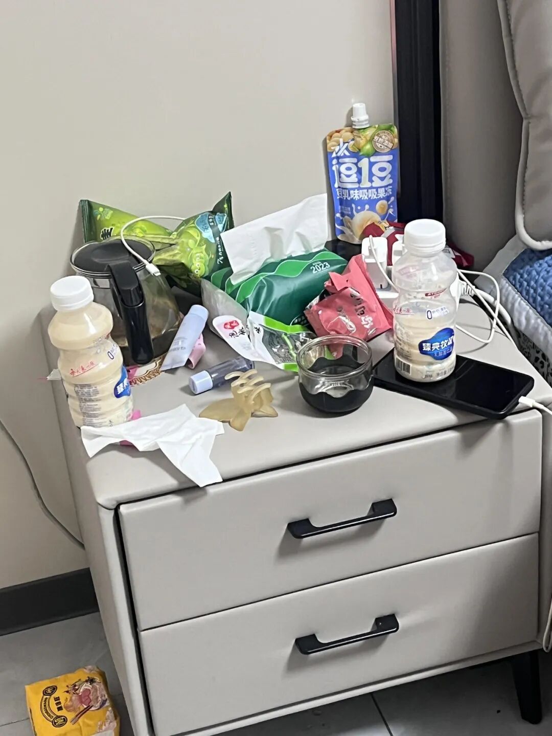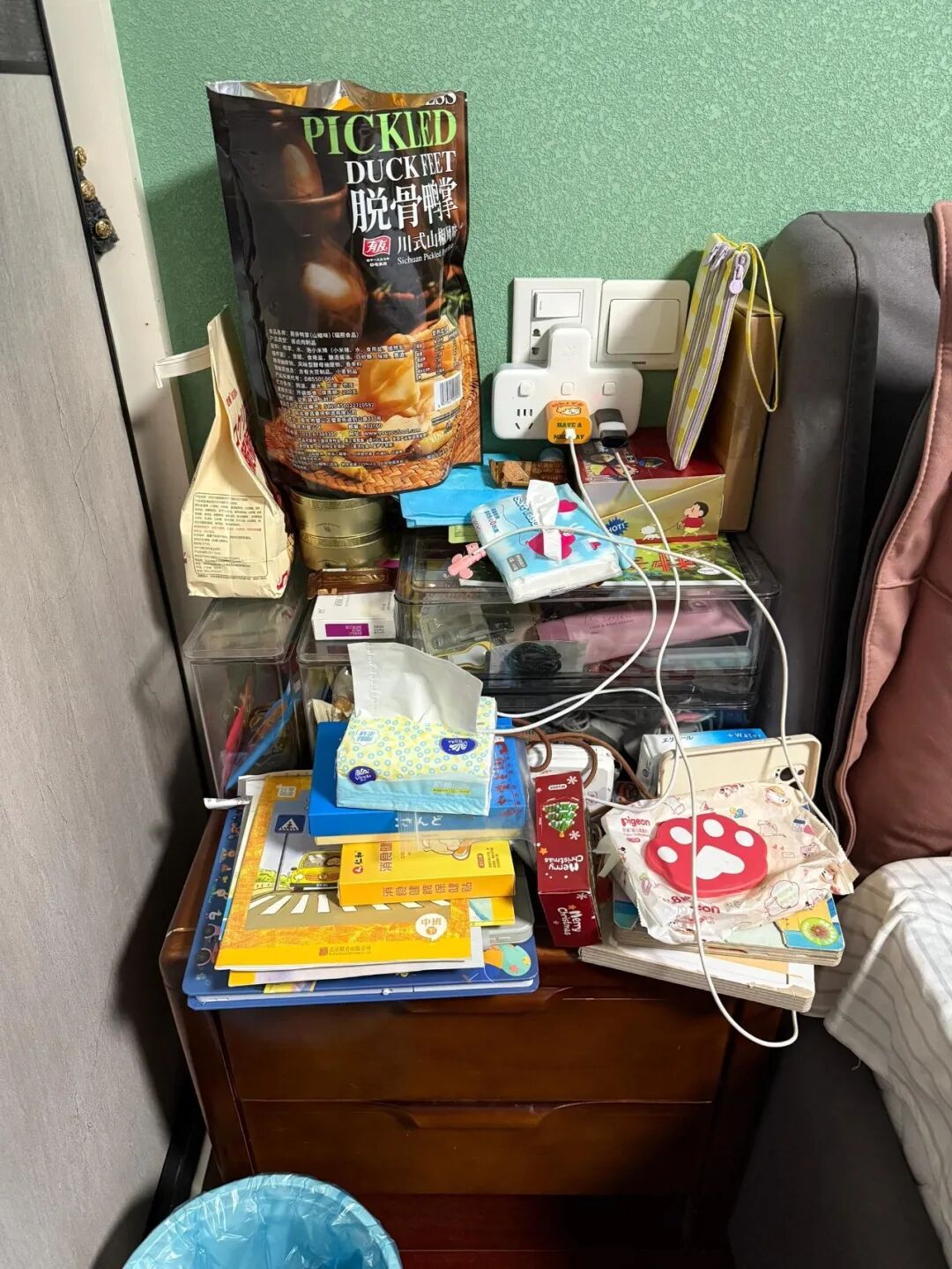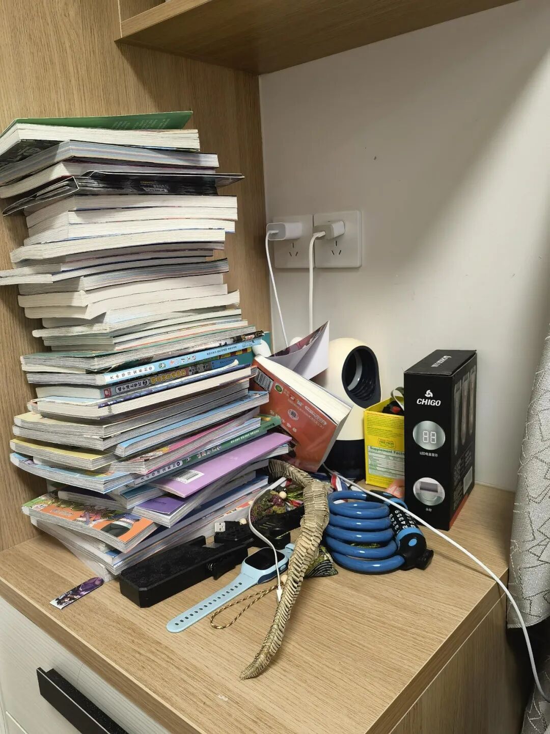 网友@野香菜 说:“我家床头柜,早已沦为杂物堆了,东西越堆越多,柜子里也放满了,离谱到家了!”