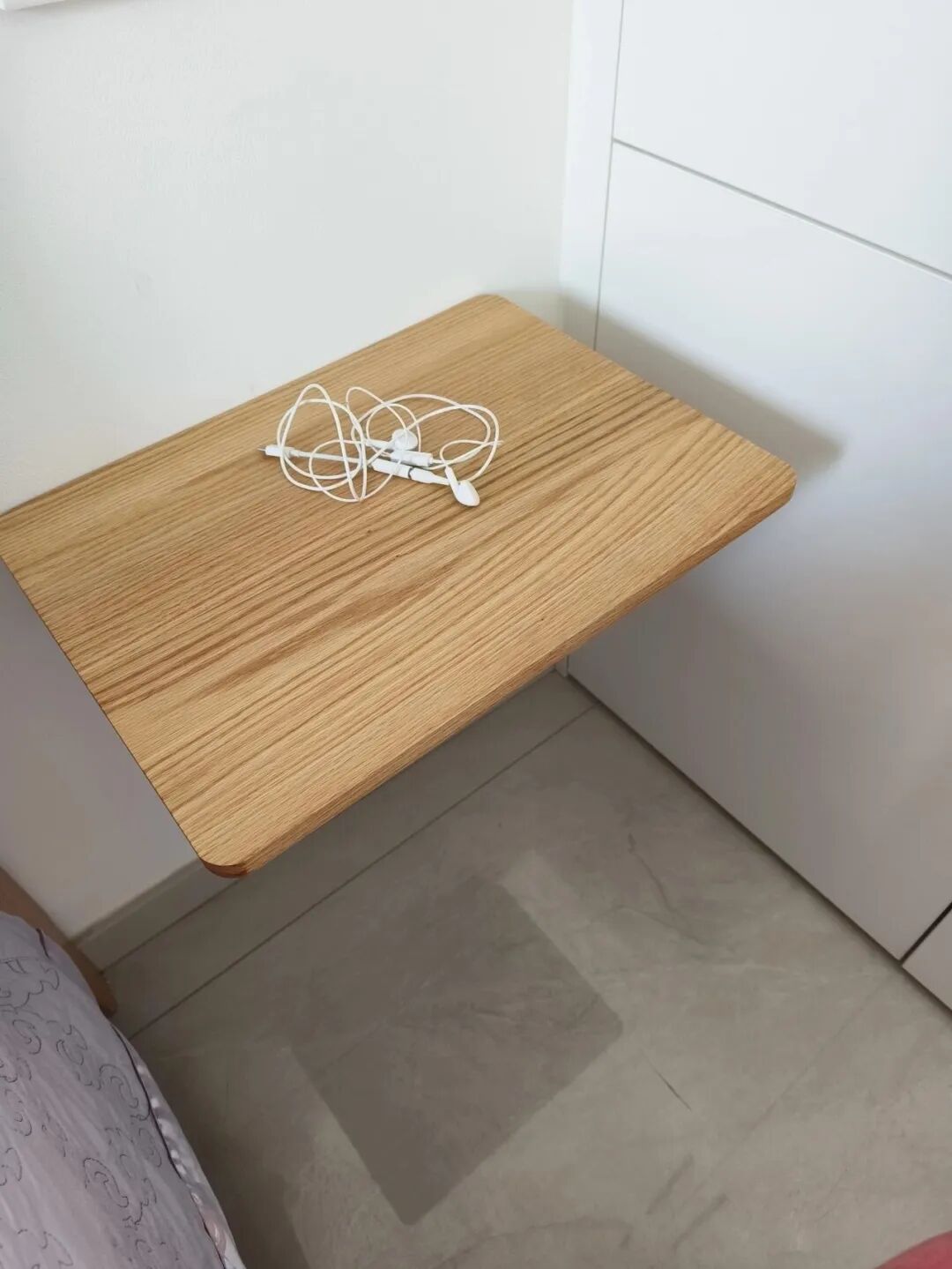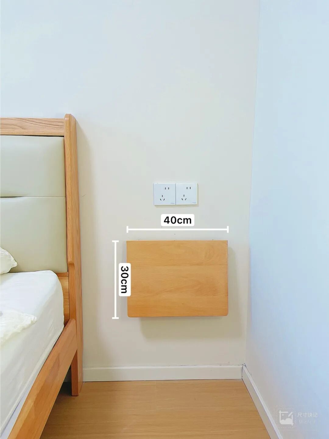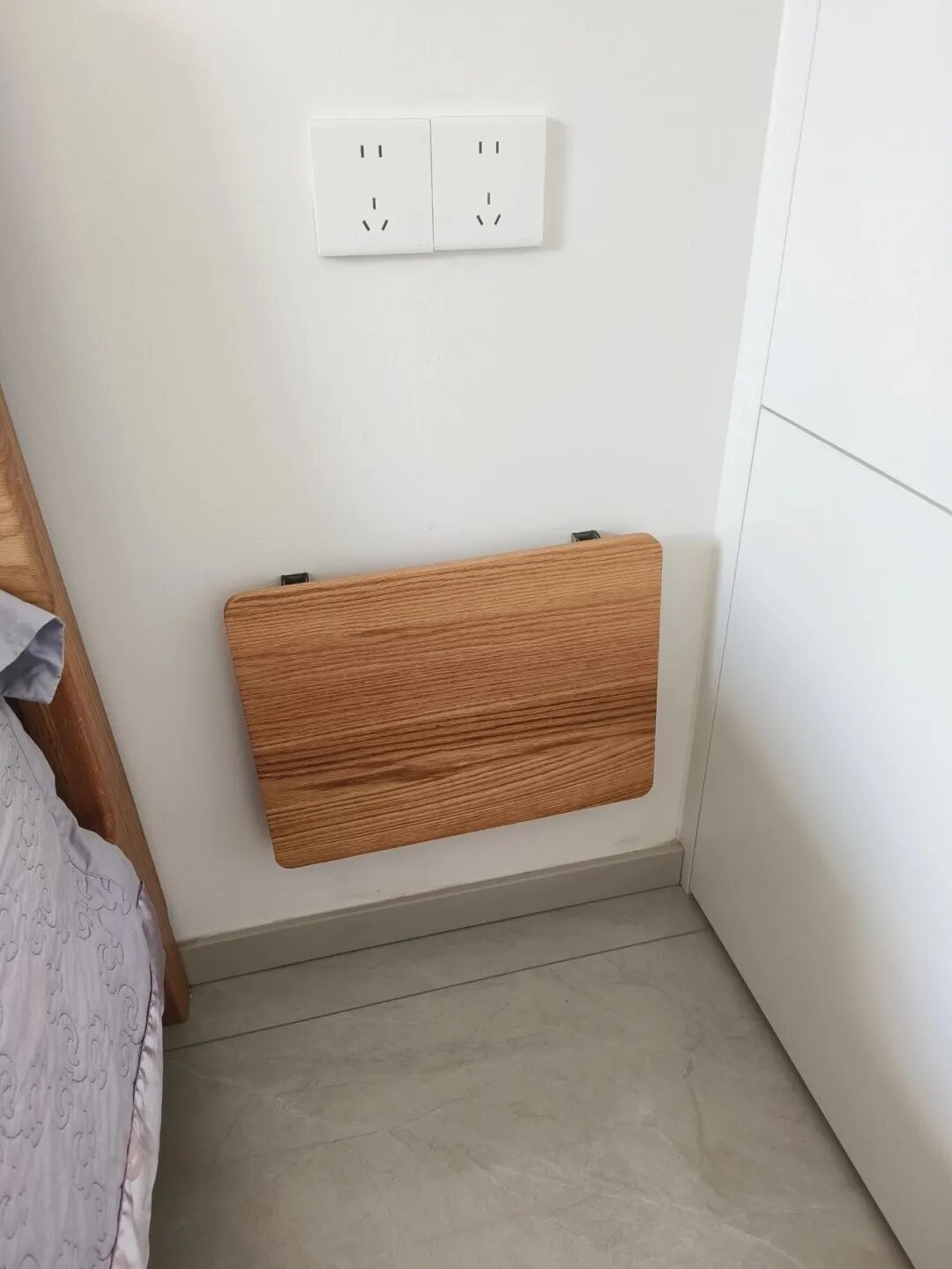 卧室空间有限,放个大床头柜太碍事了,自己DIY做了一个折叠小桌板,轻松省下几百块,只需要定制一块木板加上两个三角架就OK。