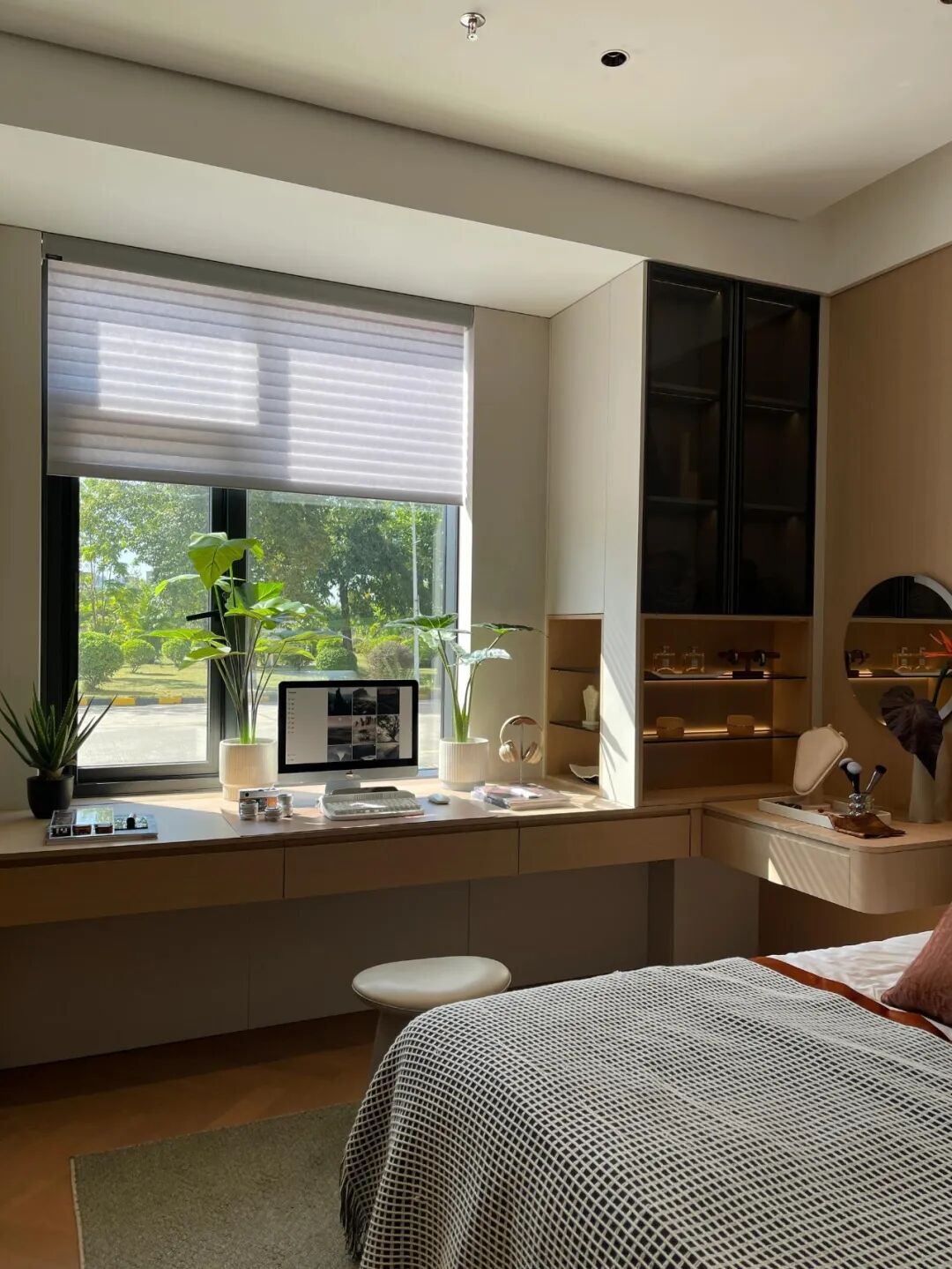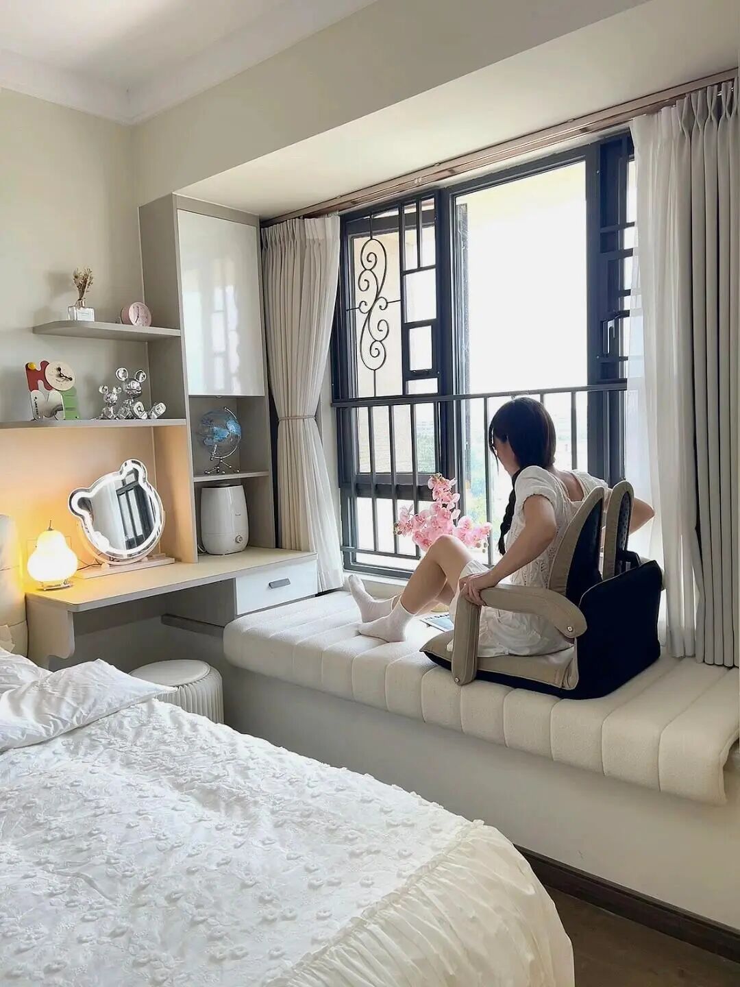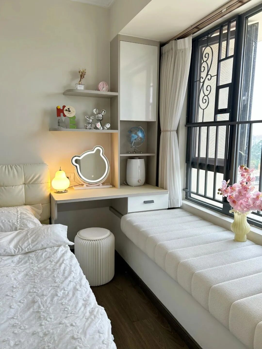 家里床靠窗的姐妹,飘窗别浪费,飘窗书桌➕收纳柜➕梳妆台,这样设计比单独买一个床头柜实用多了。