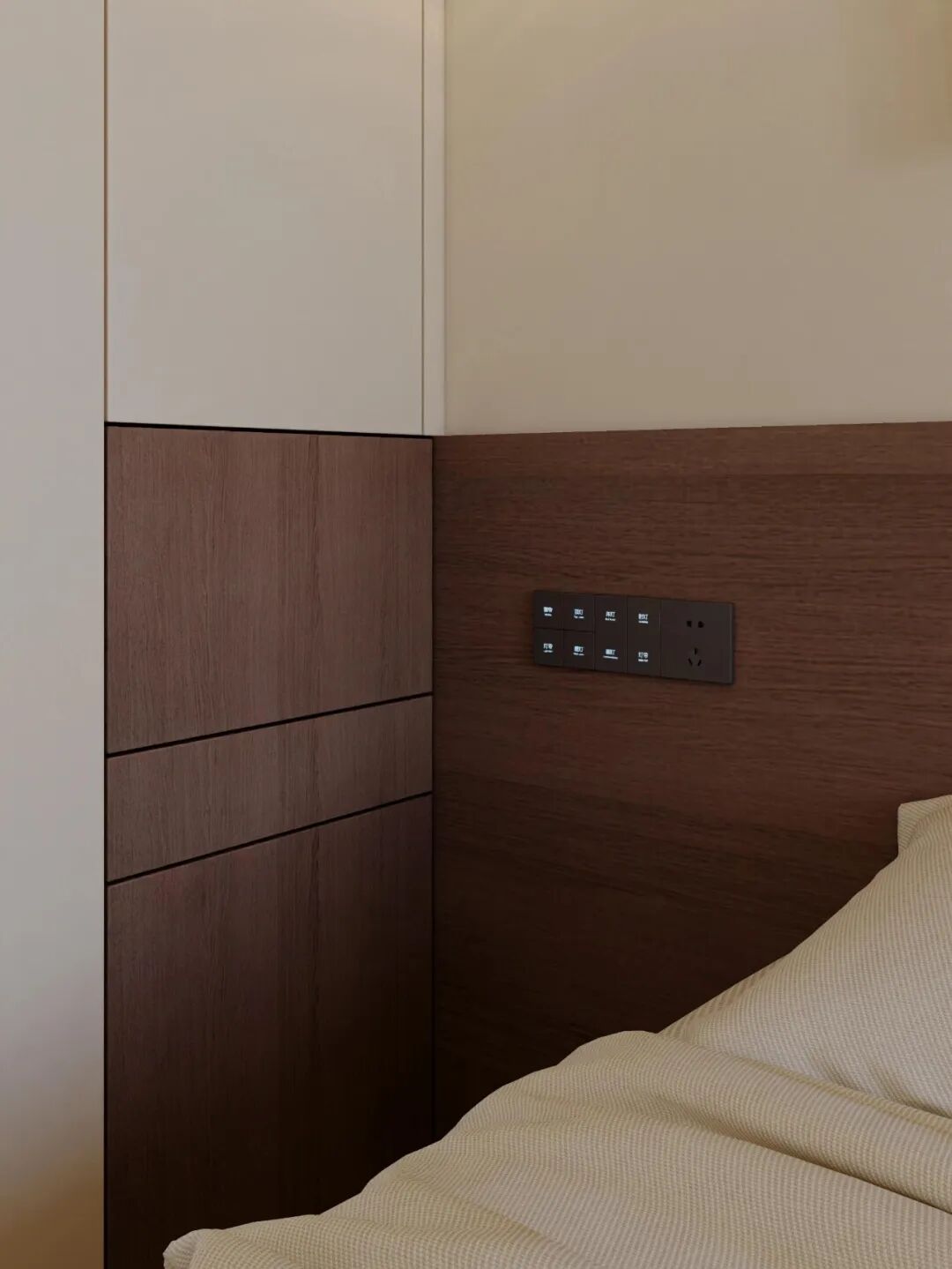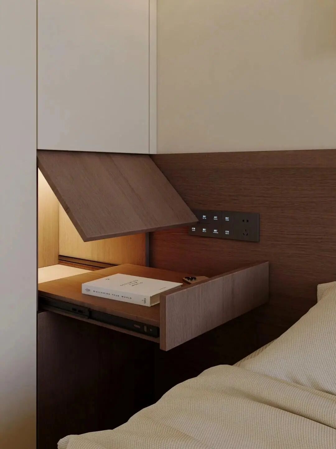 现在时代变了,我们的生活习惯也变了。手机替代了闹钟,电子书替代了纸质书,传统床头柜的功能,被稀释得一干二净。与其留着占地堆杂物,不如换种思路,让床头空间既整洁又高级。