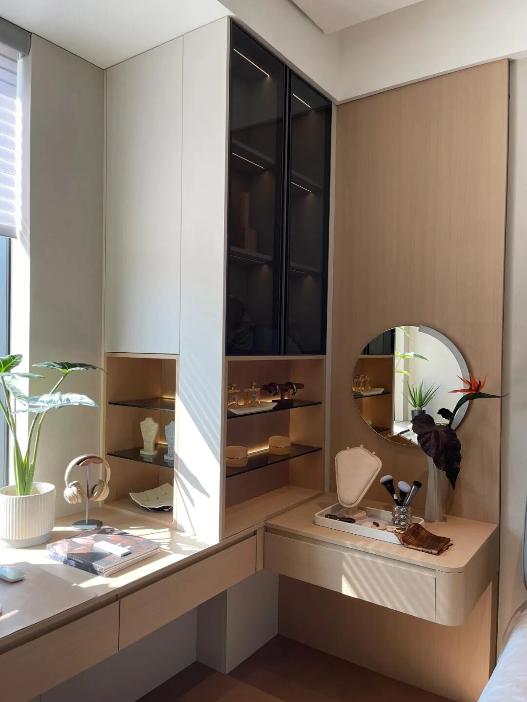 不用时推进去,衣柜恢复平整,零占地、不碍动线,还显高级,特别适合小户型。