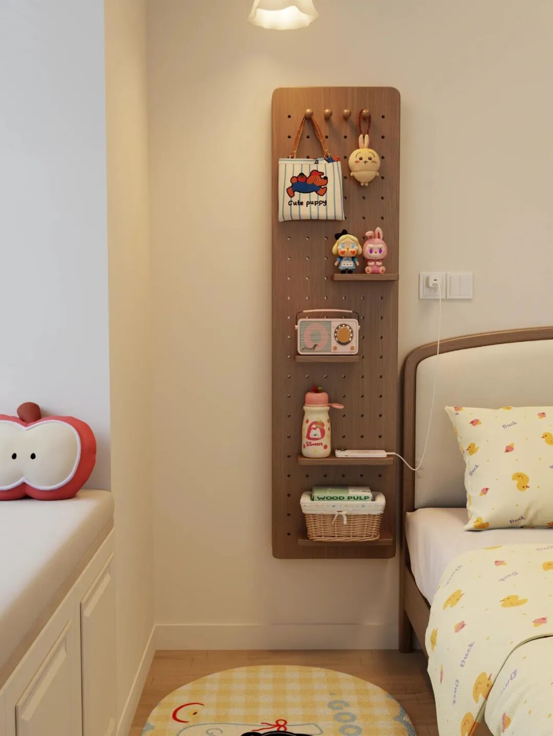 洞洞板这几年火到不行,简直是小户型的收纳神器!把一块洞洞板装在床头,收纳方式灵活到飞起,洞洞板可以随意加搁板,放水杯、手机、纸巾,还可以挂各种小物件。
