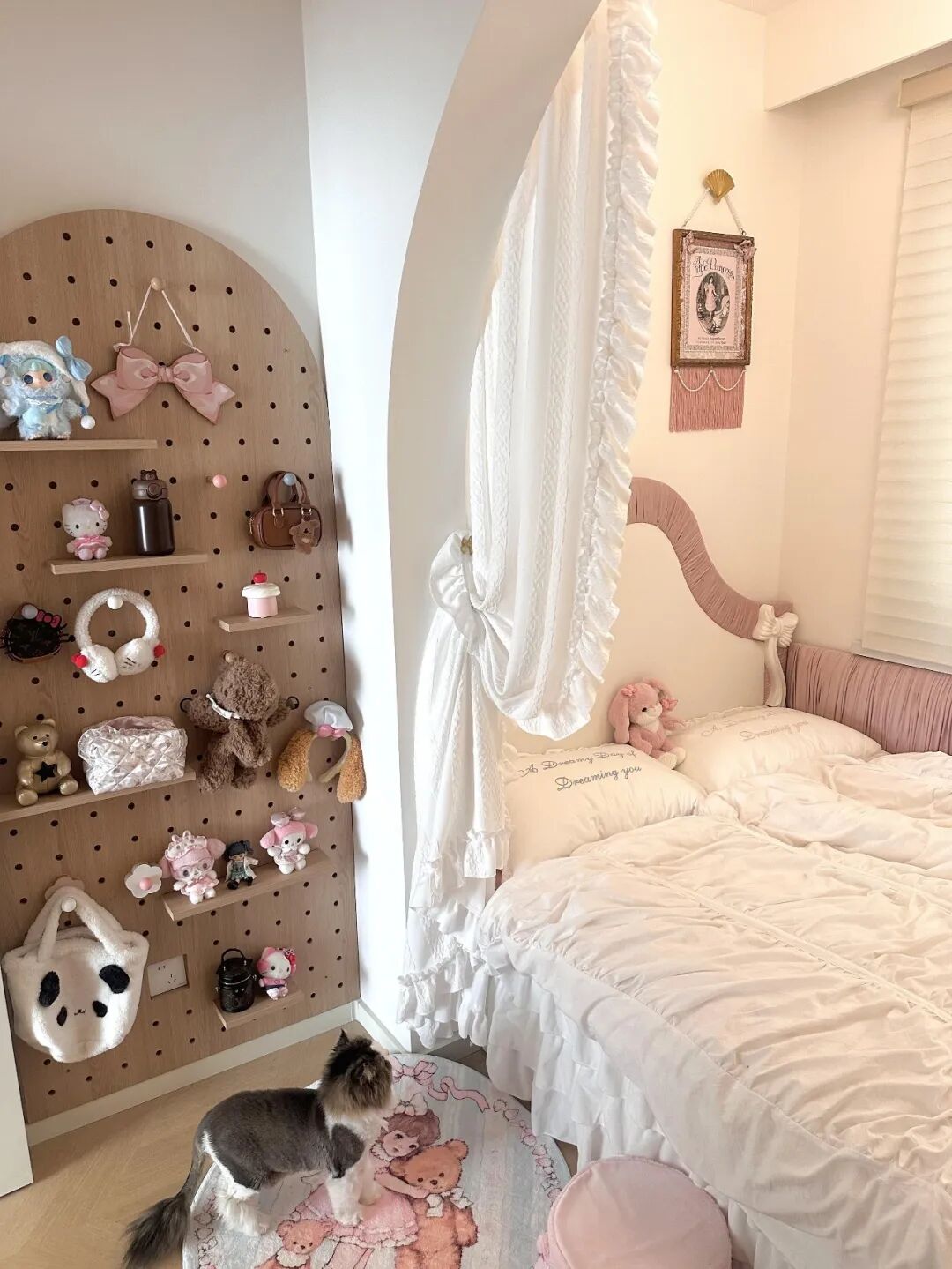 房间小,根本没地方放床头柜,定制了一块洞洞板,装在大白墙上,比床头柜实用,而且很好看,卧室一下子温馨了好多。