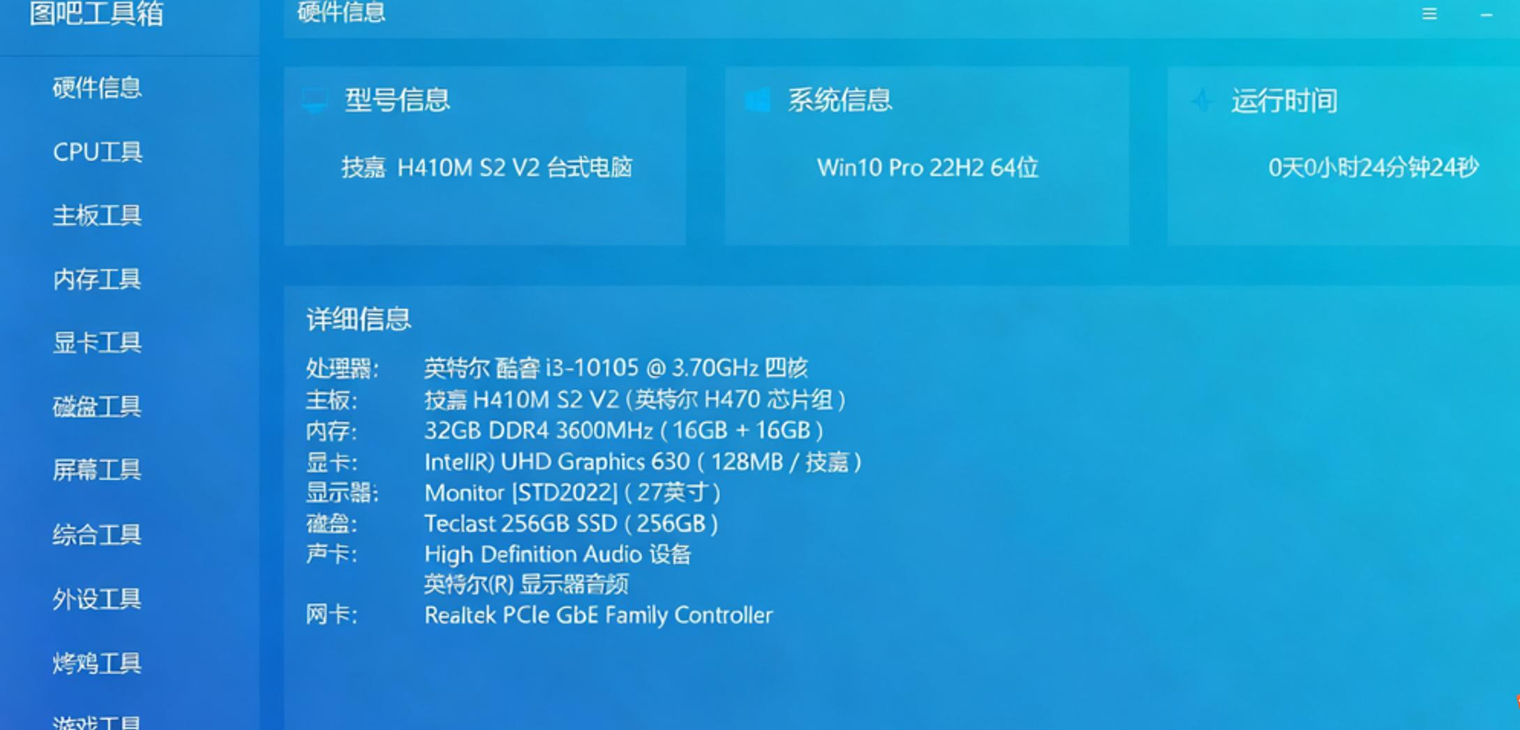 对于装机玩家来说,跑分环节永远是最让人期待的 “验货时刻”!本次测试我们搭建了一套性价比拉满的硬件平台 —— i3-10105 处理器负责 “算力输出”,技嘉 H410M S2 V2提供稳定超频支持,显卡确保游戏画面不拖后腿,再配上Teclast 256GB 固态保障存储速度,而主角正是酷芯客刀客 32GB DDR4 默认频率3600( 内存。这套配置无论是用来搞生产力,还是畅玩游戏都足够给力,感兴趣的小伙伴完全可以直接 “抄作业”!