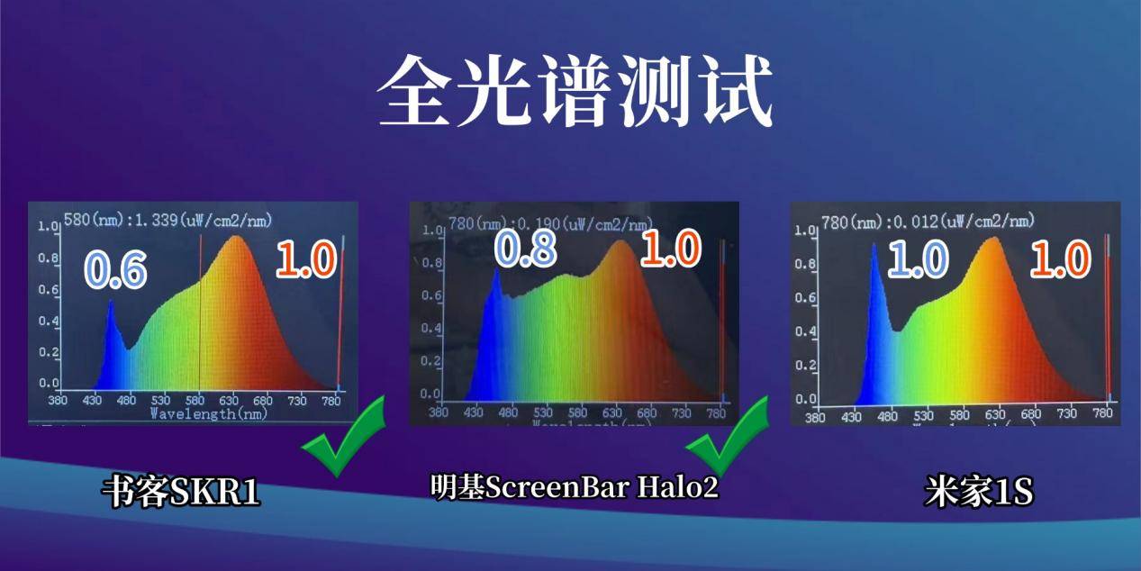 米家屏幕挂灯好用吗?这三款屏幕挂灯的全光谱情况如图,其中书客SKR1的表现可以说是最好的,仅有0.6的蓝光含量和高达1.0的红光含量,在护眼抗疲劳方面表现得很不错,书客SKR1采用了蓝光过滤技术能够吸收并转化光线中的部分蓝光,相比普通灯具可减少约64%的蓝光能量,有效降低短波蓝光辐射,从而减轻约28%的眼睛疲劳,并在各种光照环境下提升视觉舒适度。而明基ScreenBar Halo2的全光谱表现也是不错,可以看到蓝光方面也是有经过处理的,蓝光含量达到了0.8,而红光含量达到了1.0,也是可以比较不错的缓解眼睛疲劳。而米家1S的全光谱表现相对来说就比较差,蓝光比较高,达到了1.0,虽然红光含量也达到了1.0,但是长时间使用眼睛相对来说会更容易感到疲劳。