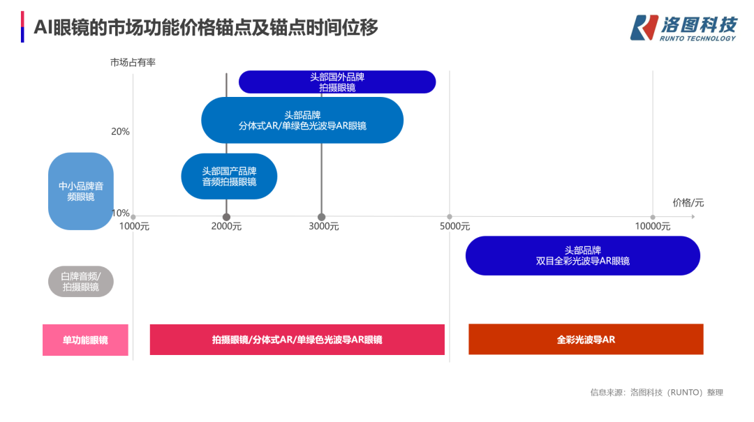 AI眼镜市场形成了清晰的价格锚点。中小品牌音频眼镜价格不足1000元,带摄像头拍摄功能的头部品牌价格约2000元,分体式/单绿光波导AR眼镜及国外拍摄眼镜约3000元,头部品牌的双目全彩光波导AR眼镜受成本影响定价均高于5000元。