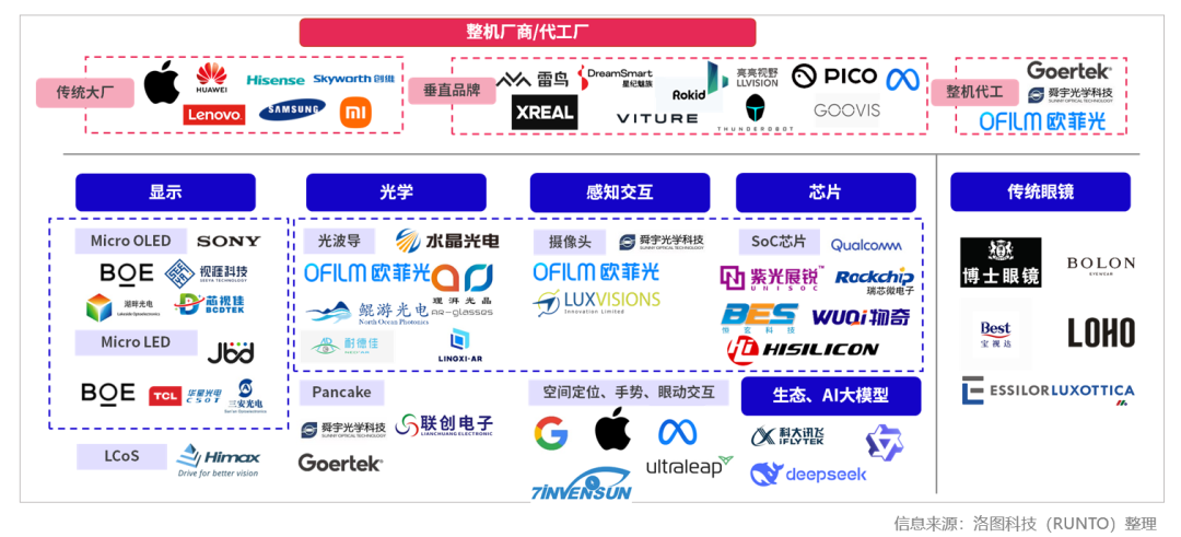 中国AI眼镜供应链已实现全链条覆盖,全球超70%的XR产品在中国制造。从音频、显示器件,到中游结构件,再到整机代工,以及ePOP存储芯片,形成了完整的供应链体系。