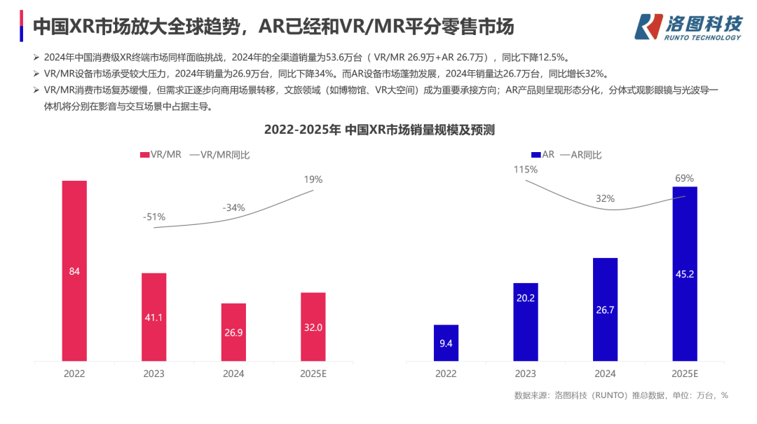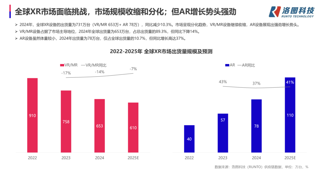根据洛图科技(RUNTO)数据显示,2024年,全球XR设备的出货量为731万台,同比下降10.3%。市场呈现显著分化:VR/MR持续收缩;AR则增长强劲,2024年的增幅高达37%。
