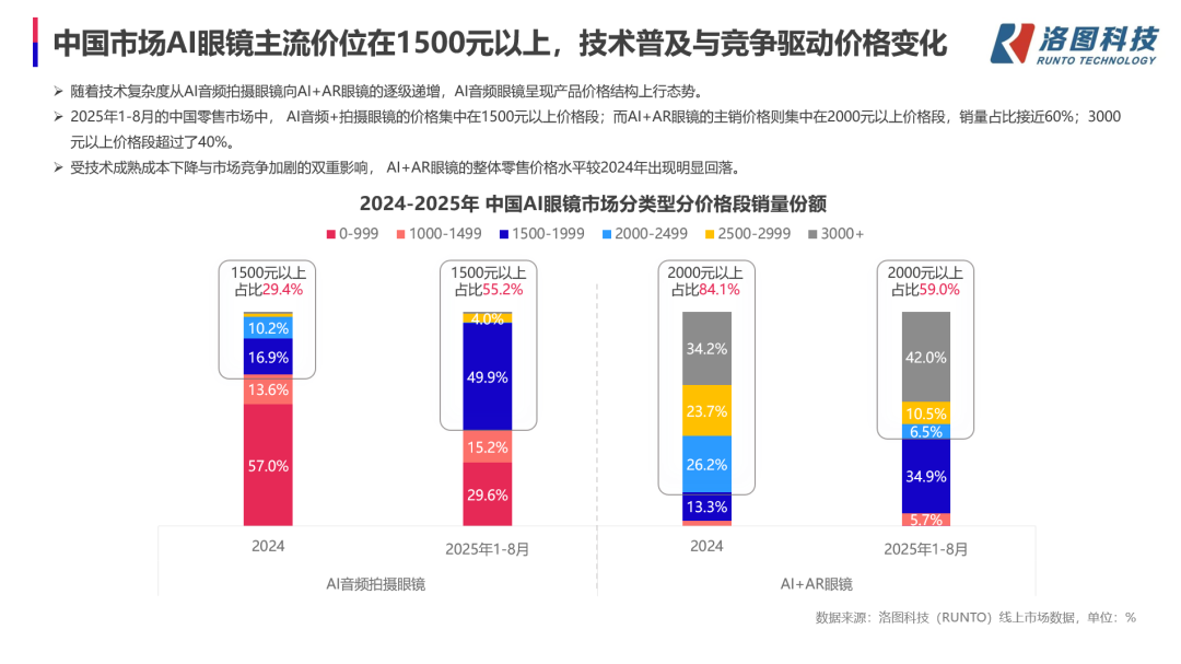 AI眼镜在中国线上零售市场的主流价位在1500元以上。根据洛图科技(RUNTO)线上监测数据显示,2025年1-8月,AI音频拍摄眼镜市场中,1500元以上的销量占据了55.2%;AI+AR眼镜市场中,2000元以上销量的占比接近60%,3000元以上则超过了40%。
