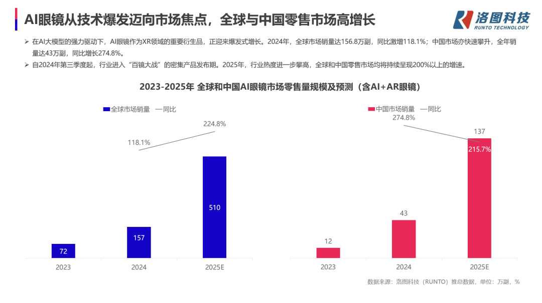 自2024年的第三季度起,行业进入“百镜大战”,洛图科技(RUNTO)预测,2025年,全球与中国AI眼镜市场的销量将为510万和137万副,增速均将超过200%。