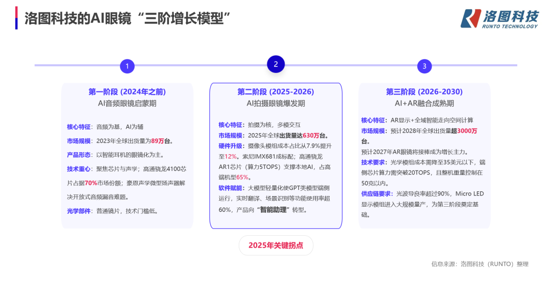洛图科技基于连续四年的行业监测,提出AI眼镜“三阶增长模型”,清晰勾勒出从功能到智能的进化路径,而2025年正处于第二阶段向第三阶段跨越的关键节点。