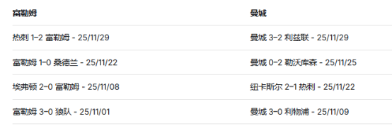 富勒姆 vs 曼城交锋记录(最近五场)