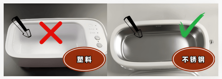 市面上很多低价劣质产品在宣传上会用“超声波”代替“震动”,其实是就是依靠振动马达的清洗盒,仅靠物理晃动水来清洁,效果根本比不上真正的超声波清洗机。购买时要注意甄别。