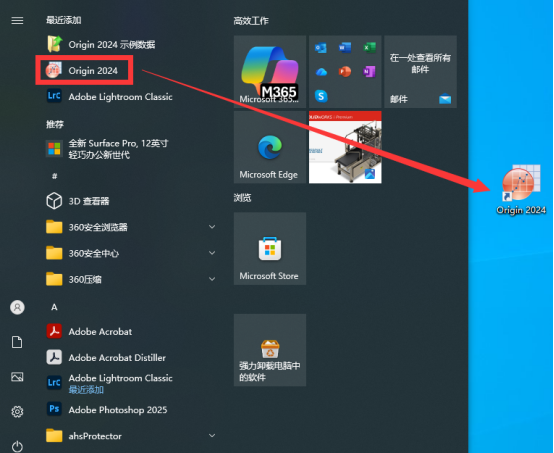 20、点击电脑桌面左下角开始按钮,找到刚刚安装的【Origin 2024】软件,鼠标左键按住不放,拖拽到电脑桌面。