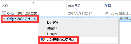 25、点击【Origin 2024切换中文】文件,鼠标右键,选择【以管理员身份运行】(运行完成后会自动关闭)。