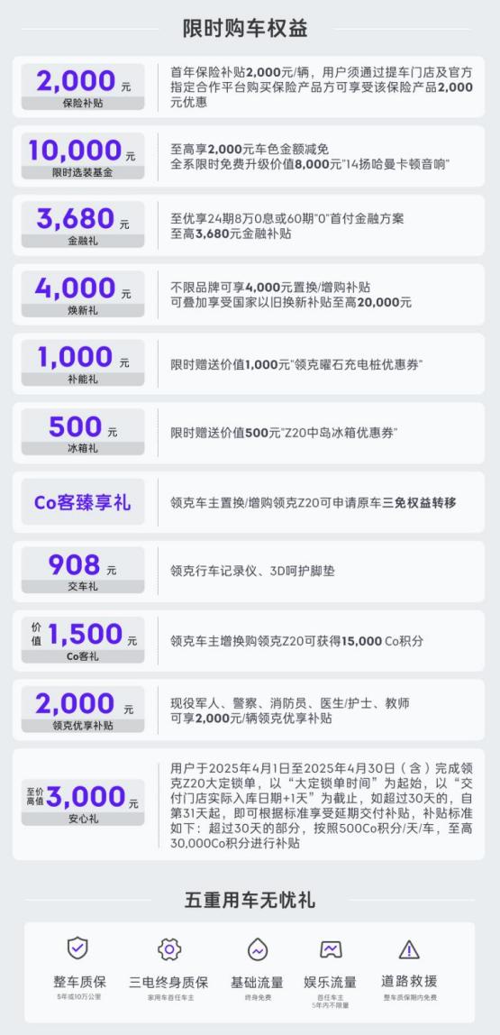 价格方面,领克Z20也展现出了十足的诚意。在2025年4月1日至4月30日期间,购买领克Z20可享至高超28588元限时购车权益,限时价仅13.59万元起。这样的价格政策,让消费者能够以相对较低的成本拥有这款综合性能出色的车型。