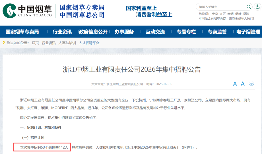 近日,浙江中烟官网发布招聘公告,共招115人,其中包含校园招聘3人和集中招聘112人。