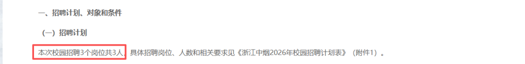浙江中烟2026年校招有3个岗位,招聘3人,1个岗位要求“硕士研究生及以上”,2个岗位要求“博士研究生”。