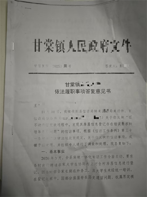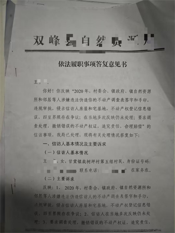 王女士先后向娄底市、湖南省及国家信访单位投诉,相关事项多次被督办,但始终未得到实质性处理。双峰县自然资源单位、甘棠镇行政单位在相关答复中,承认村公务人员邹某来、王某桃存在工作不实问题,对二人作出责令检查、批评教育处理,也对部分错误信息进行了更正,但以权属争议、家庭内部意见不统一、相关当事人去世等为由,未满足撤销邻居虚假证件、追究镇公务人员、相关土地单位人员及涉事执法人员责任,以及赔偿误工、交通、精神损失等诉求,明确表示不存在依法赔偿的情形。镇、县两级部门均告知其可通过行政复议或行政诉讼途径权益维护,但自然资源单位出具的答复意见书无编号、无签发人,王女士申请复查、复核及行政复议时,均被认定为材料不规范。