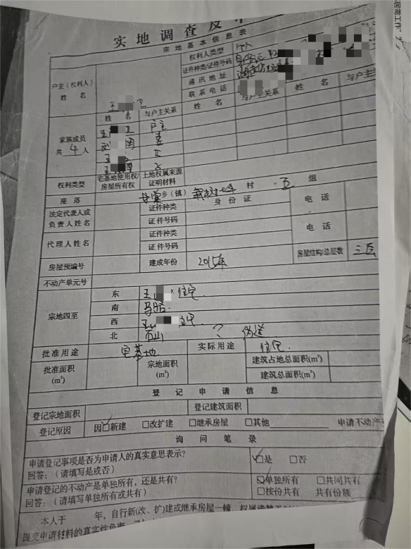 2020年双峰县开展房地一体化确权登记时,王女士全家在外务工。登记过程中,村相关负责人邹某、王某桃被指在持有联系方式未联系权利人、未由本人及家人签字按手印的情况下,完成房屋信息登记,导致登记内容存在失实。房屋户型由长方形变为7字形,层数由主房三层、辅房一层改为二层,建筑面积从800余平方米变为435.73平方米,宗地面积、四至边界均被大幅篡改,东边厅堂、火房、果地被登记为空地,西边厕所及地坪被登记为人行道,北边菜园被登记为石山。