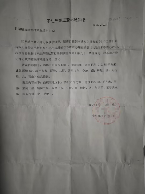 一份盖有公章的不动产更正登记通知书,白纸黑字承认登记信息大部分错误,却没能为湖南双峰县甘棠镇栽树坪村村民王女士夫妇换来公道。整整一年多时间里,他们为讨回被篡改的宅基地与房屋权属四处奔走、反复申诉,不仅问题迟迟得不到解决,还接连遭遇单方测绘、信息封锁、人身伤害,全程充满无奈与艰辛。