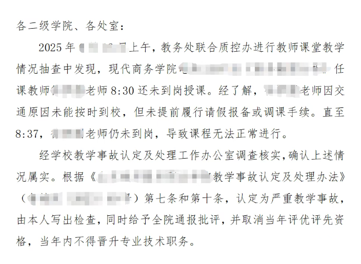 这不,有网友曝光出来,山东某高校教务处发布了一份关于某教师严重教学事故的通报。而这个老师没到学校的原因就是因为交通原因没能按时到校,但是找不到代课的人,也就是没能提前请假同时进行调课。结果他的早八,直至8:37还没到教室。结局挺惨,这个老师被学校认定为严重教学事故,最终写检查,全院通报批评,同时还取消了当年评优评先资格,不得晋升专业技术职务。