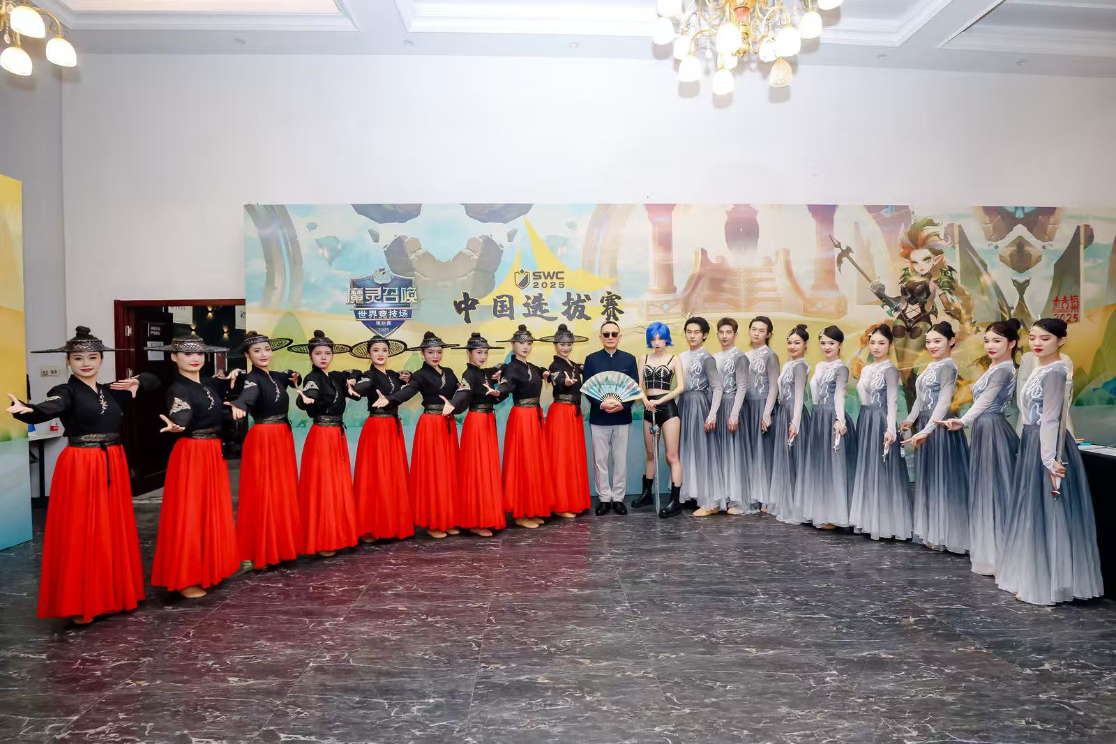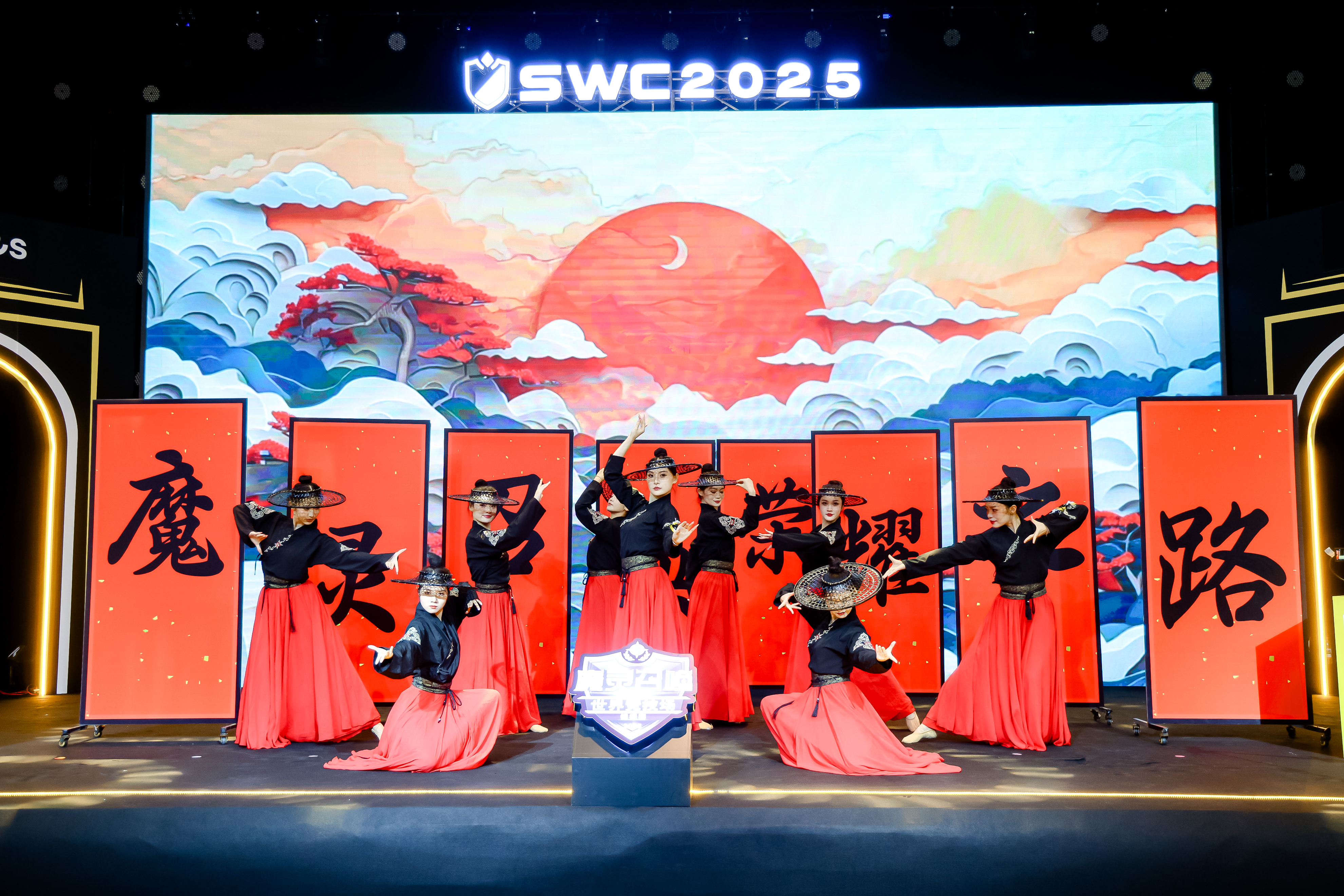 随后舞蹈节目《萍踪侠影》闪亮登场。舞者用洒脱的肢体语言演绎江湖侠影的豪迈,手中那扇“门”在舞台灯光下变化莫测——时而化作守护屏障,时而化作华丽舞台。最终在音乐的尾声中,舞者定格于中央,聚光灯下,“魔灵召唤 荣耀之路”八个大字映照在舞台门上,为今天的比赛拉开了庄严而隆重的序幕。