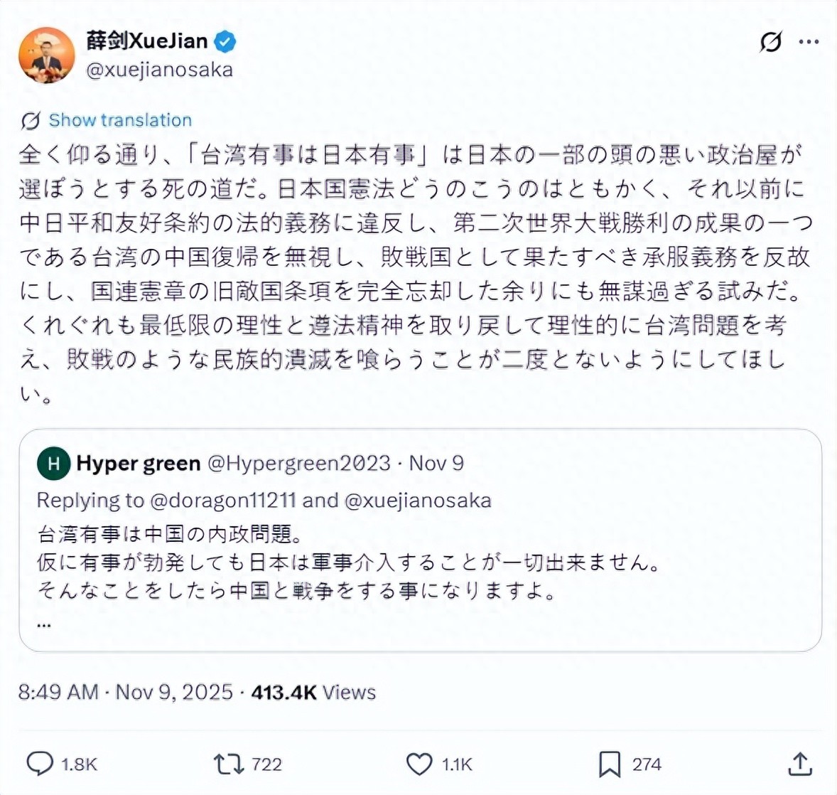 最近日本首相高市早苗发表了涉台错误言论,声称若中国大陆对台使用武力可能构成“存亡危机事态”,自卫队可行使集体自卫权,此言论掀起巨大舆论。中国驻日本大阪总领事薛剑这些天更是火力全开,声称“谁胆敢伸进脖子来搞事,我们将毫不犹豫斩掉那肮脏的手”,而且日语机翻就是为那些日本右翼量身定做的,“擅自闯入者,必将毫不犹豫斩下其肮脏首级”。之后,还继续用日语发文称,“‘台湾有事就是日本有事’是日本某些愚蠢的政客妄图选择的死亡之路”,这是违背作为战败国应尽的臣服义务,完全忘却联合国宪章中旧敌国条款的过于鲁莽的尝试。希望日本务必重新找回最起码的理性和守法精神,不要再遭受像战败那样的民族灭亡之苦。之后还列出了各种史实,以及解放军航母编队的图片,主打一个就是往日本右翼肺管子戳的架势。