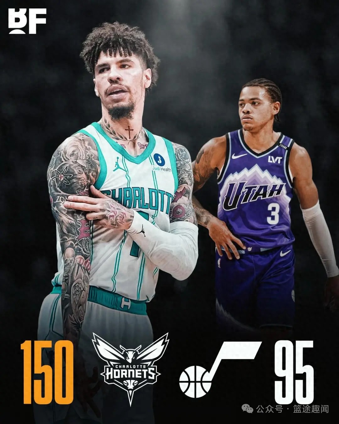 这原本应该是一场实力相近的较量,却变成了一边倒的“惨案”。爵士在自家主场被黄蜂打得毫无还手之力,最终以 95比150输掉了比赛,分差达到了惊人的55分。