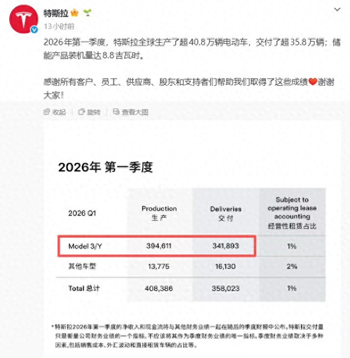 中国市场逆势增长:上海工厂Q1交付21.3万辆,同比增23.5%,占全球总量的59.5%,3月单月交付8.57万辆创年内新高。