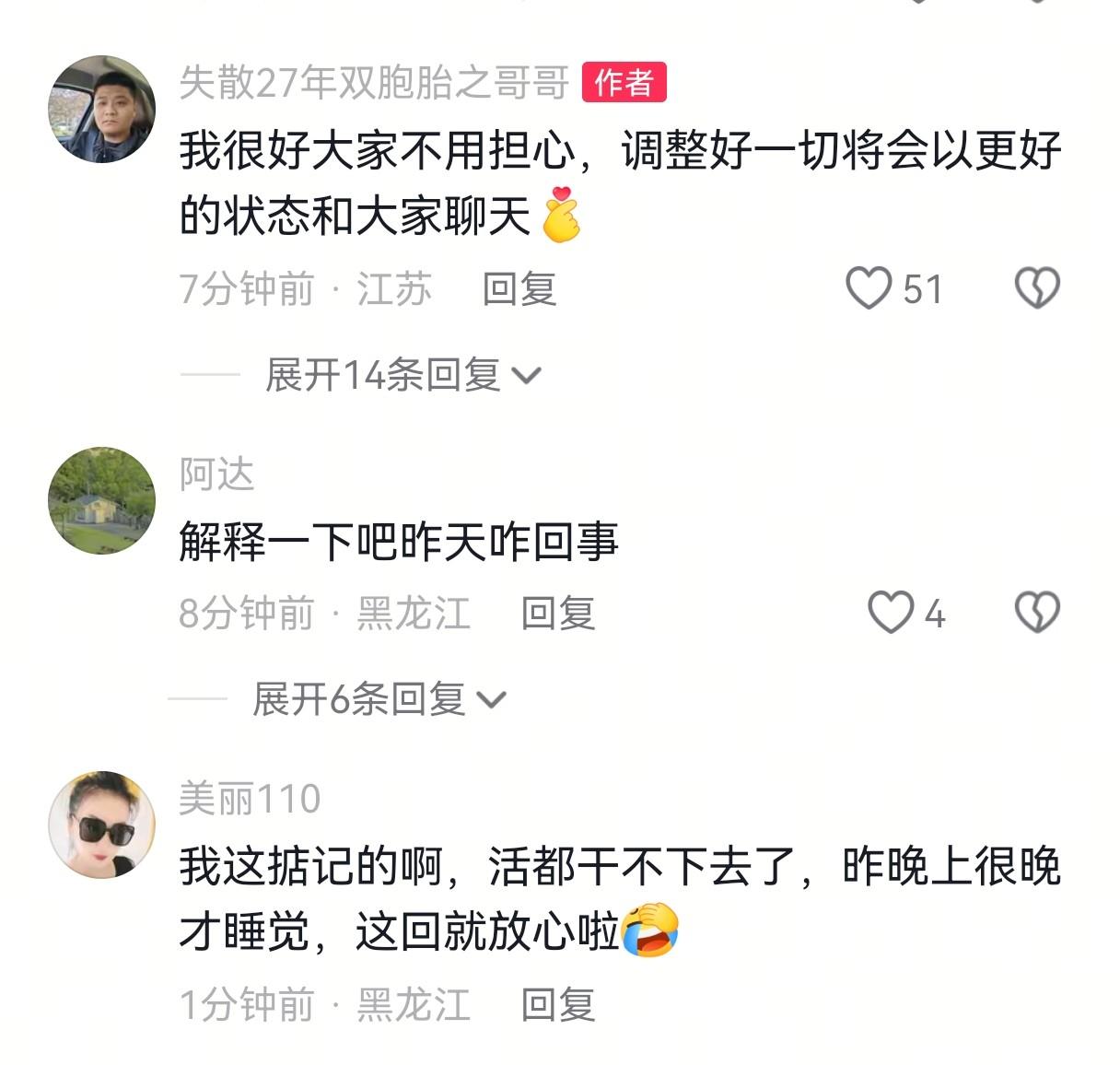 双胞胎哥哥回到老家江苏宿迁这几天,在热度最高的时候没有直播,网友们很担心他,纷纷询问他是不是出事了。