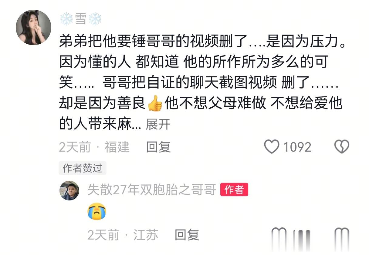 曾有网友锐评:弟弟把他要锤哥哥的视频删了,是因为压力,哥哥把自证的聊天截图视频删了,却是因为善良。他不想父母难做,不想给爱他的人带来麻烦。